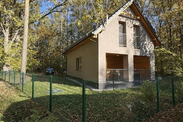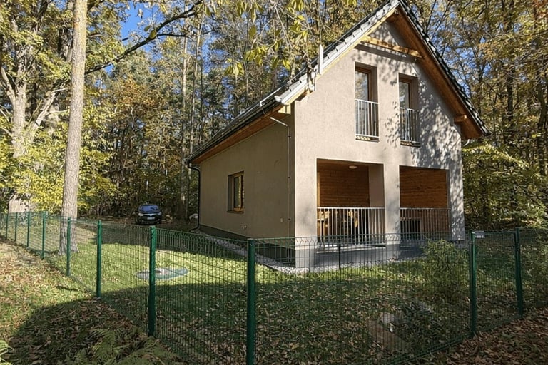 Zcela nový dům obklopen nádherným lesem plným borůvek a hub.