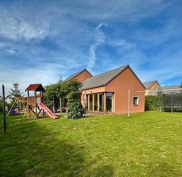 Dům je obklopen zelení, má svoji velkou oplocenou zahradu. Na zahradě je dětské a sportovní hřiště, gril a prostorná terasa.